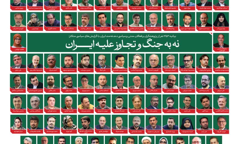به گزارش خبرگزاری خبرآنلاین، ۳۵۳ نفر از «پژوهشگران، فعالان مدنی و سیاسی و دغدغه‌مندان ایران» باطیف وسیعی از گرایش‌های متکثر بیانیه‌ای با عنوان «نه به جنگ و تجاوز علیه ایران» امضا و منتشر کرده‌اند و از عموم شهروندان دعوت کرده‌اند صدایشانعلیه جنگ و تجاوز به ایران را بلند کنند.
