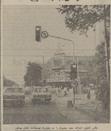 روزنامه اطلاعات ۲۱ مرداد ۱۳۵۲ در یک عکس نوشت نصب تابلوهای گردش به چپ ممنوع در کنار چراغهای راهنمایی و رانندگی را مستند کرده و نوشته که دیگر تخلف با این بهانه که: تابلو را ندیدم از متخلفان قابل قبول نخواهد بود. عکس را جمشید ابراهیم زاده ثبت کرده است.